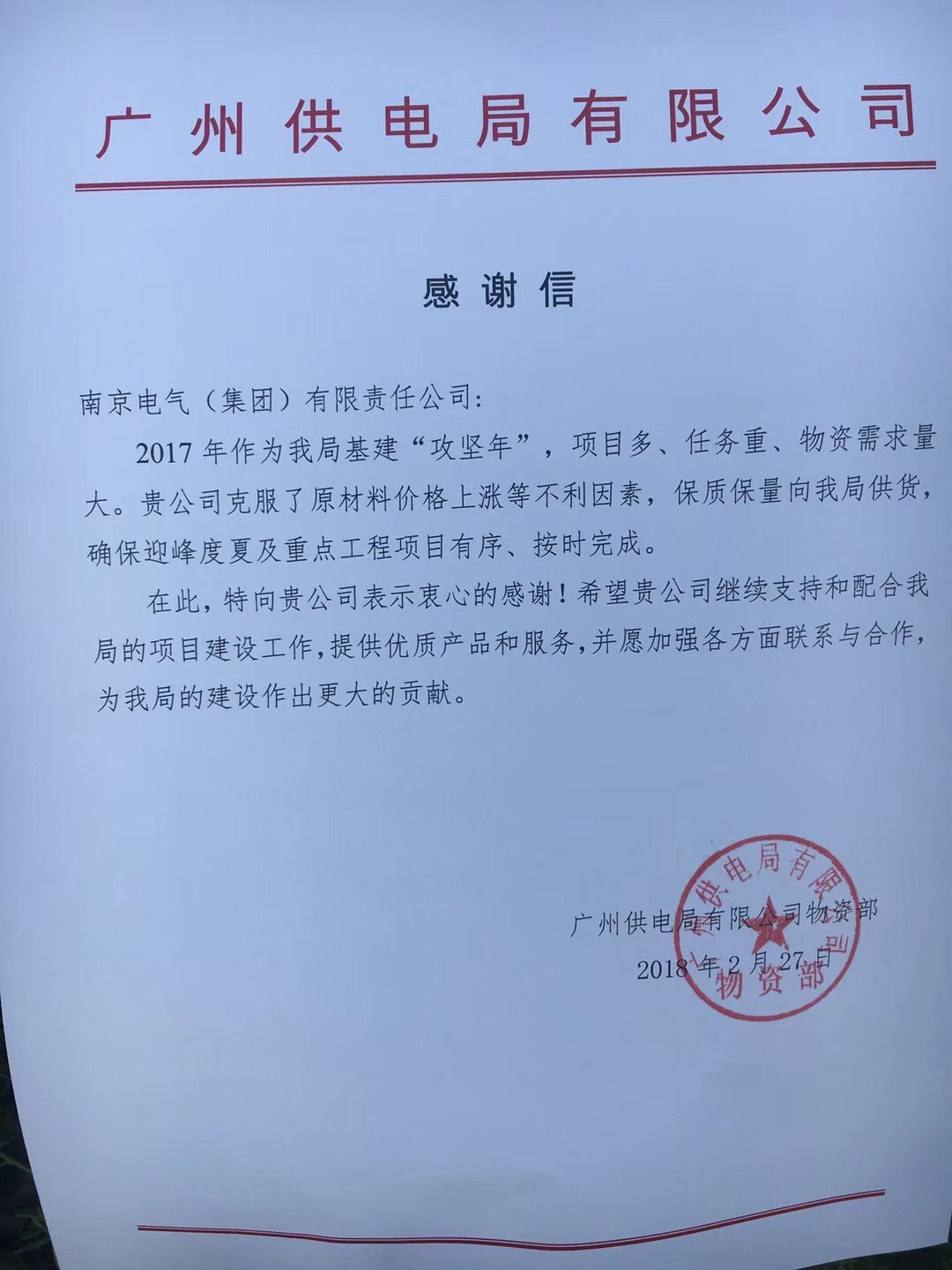 廣州供電局有限公司近日向南京電氣(集團(tuán))有限責(zé)任公司發(fā)來感謝信,對(duì)南京電氣去年保質(zhì)保量向該局供貨、確保迎峰度夏及重點(diǎn)工程項(xiàng)目按時(shí)完成表示感謝。 感謝信說,2017年作為我局基建“攻堅(jiān)年&...